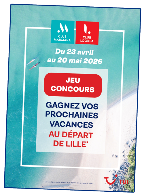 - Le gain est un séjour en CLUB LOOKEA ou CLUB MARMARA de 7 nuits pour 2 personnes incluant, la chambre double, la formule tout inclus, les transferts aéroport/club aller-retour, les vols affrétés aller-retour depuis Lille en classe économique pour un départ au plus tard le 31/03/2027 et hors vacances scolaires.