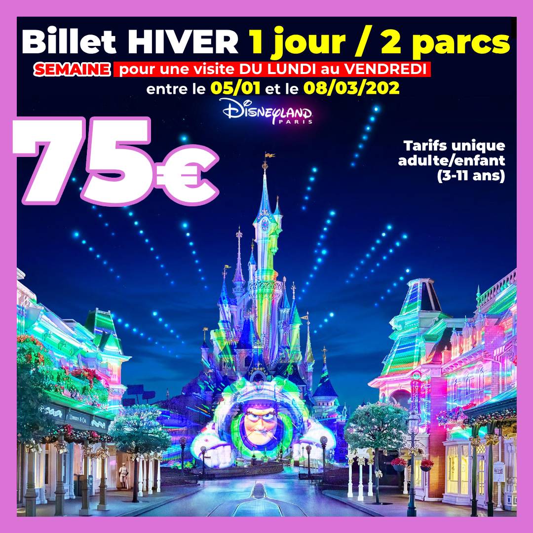 Tarif unique ADULTE/ENFANT valable uniquement pour une visite entre le 5 janvier et le 6 février 2026 dans les 2 parcs de Disneyland Paris.